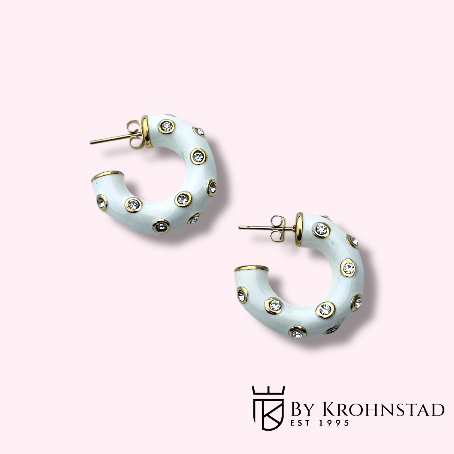 Lyx och elegans i perfekt harmoni! Dessa 18K guldpläterade örhängen är dekorerade med vit emalj och gnistrande små stenar som fångar ljuset på ett magiskt sätt. En tidlös accessoar som lyfter varje look!